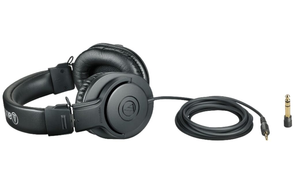 Necessitaràs auriculars durant la gravació d’instrument o veu, i aquests et permeten apreciar tots els detalls de la gravació. També ajudaran a qui grava permetent escoltar els tracks de referència com la percussió, el baix, guitarra, etc. En auriculars d’estudi trobaràs una gamma amplíssima, auriculars semioberts o tancats de diferents marques com AKG, Beyer Dynamic, Audio Technica, Sennheiser, Adam, etc. Pots comparar característiques com la seva sensibilitat, banda de freqüències, si els cables i coixinets són reemplaçables o no, etc. Aquí tens una foto dels Audio Technica ATH-M20x.