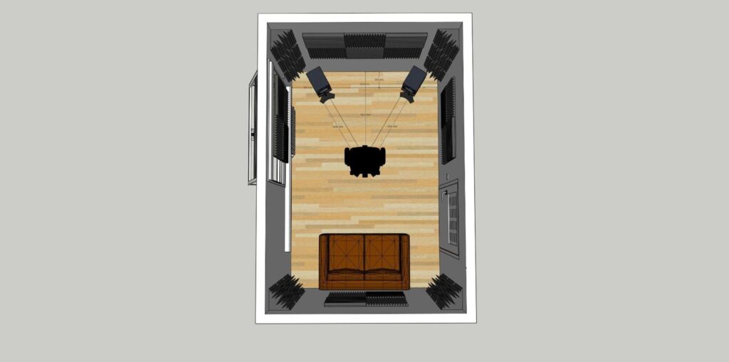 Dins el home studio, és important que et situis incialment al 38% de la longitud de la sala i tinguis els teus monitors d’àudio completant un triangle equilàter, com hauràs llegit abans a com convertir la teva habitació en un estudi. Allà hi tens tots els detalls pel que fa a l’alçada dels monitors i altres consells que t’aniràn molt bè.