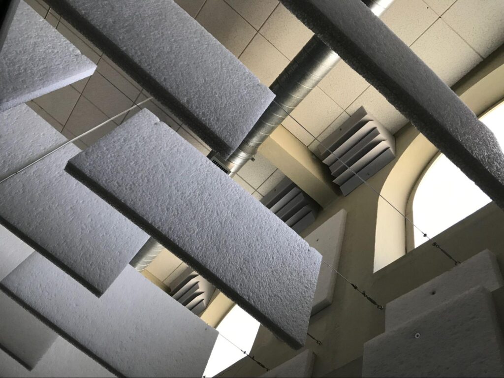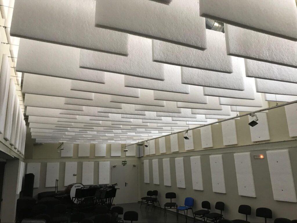Según nuestras primeras mediciones acústicas, el tiempo de reverberación RT60 rondaba 1,5 segundos. El tiempo adecuado para una sala de ensayos de esas características y uso debería oscilar entre los 0,3 y los 0,4 segundos.