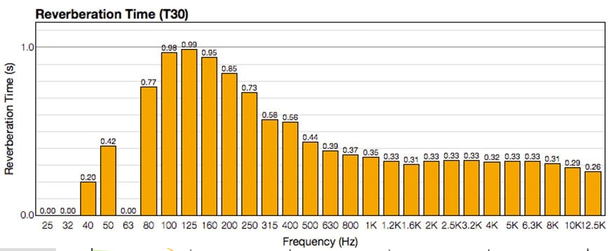 Verificamos las mediciones in situ y nuestra predicción fue completamente acertada. Tenemos un tiempo de reverberación promedio de aproximadamente 0.3 segundos, con altas frecuencias no demasiado “secas” y un agradable hinchazón en torno a los 120 Hz para obtener una gran mejora en la percepción del sonido global.